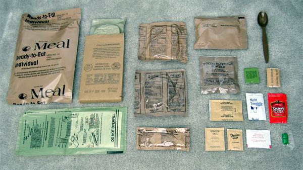 Bên trong một khẩu phần tiêu chuẩn của Lục quân Mỹ với một món chính (gói to nhất bên trái) và rất nhiều món ăn phụ.