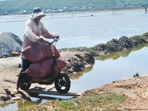 Dưới cái nắng như thiêu đốt trên đồng muối, nh́n những người vận chở muối thuê oằn ḿnh vác từng bao muối khá nặng nhọc chuyển lên xe, mồ hôi ướt đẫm, rồi khéo léo điều khiển xe men qua những bờ ruộng muối nhỏ xíu mới thấy được cái nặng nhọc của nghề.