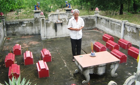 Dẫn tôi lên ngọn đồi cát sau nhà, nơi yên nghỉ của 12 đứa con tội nghiệp, ông Địu ngậm ngùi nói: “Trước đây mộ của các các con nằm ở sau làng, qua mưa gió nên bị bào mòn hết, nấm mộ nhỏ nên tìm không ra. Năm 2007, được bạn bè giúp đỡ, tôi xây thành cái lăng nhỏ cho đỡ bị cát vùi và cũng để tiện ra đây hương khói cho các con bớt đi lạnh lẽo”.