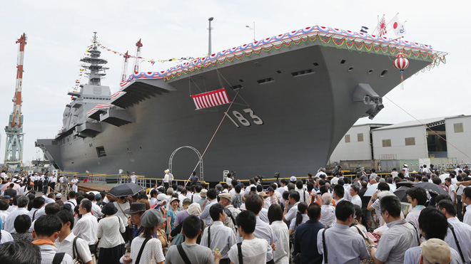 Đầu tuần này, Nhật Bản đã giới thiệu mẫu tàu chiến lớn nhất mang tên Izumo, ở Yokohama, phía Nam Tokyo. Con tàu nặng 19.500 tấn, có giá tới 1,2 tỷ USD, được Nhật Bản gọi là khu trục hạm.