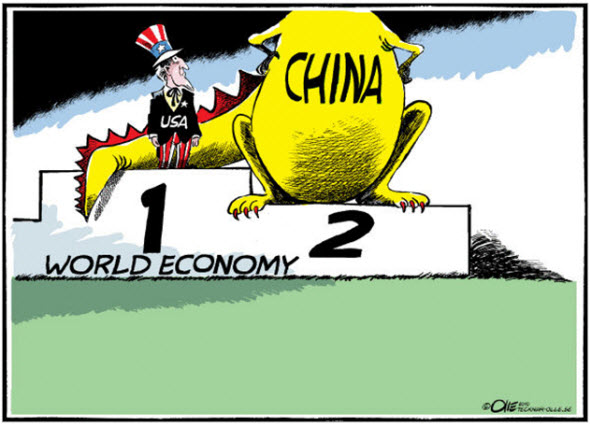 Bằng chứng là mỗi bước thụt lùi của phương Tây đều tương ứng với một thắng lợi của Trung Quốc. Năm 2008-2009, kinh tế Trung Quốc tăng trưởng khoảng 9%/năm. Năm 2010, cuộc khủng hoảng nợ của phương Tây bắt đầu diễn ra và lan rộng do tính không nhân nhượng của chủ nợ chính là Trung Quốc. Năm 2011, Trung Quốc có thể vui mừng trước đà giảm giá mạnh của đồng USD và đồng euro và chuẩn bị ngày càng công khai thay thế những đồng tiền này bằng đồng NDT. Đồng thời, dựa vào 5.000 tỷ USD dự trữ, Trung Quốc tự khẳng định mình như người thay thế tất yếu của Quỹ Tiền tệ Quốc tế.