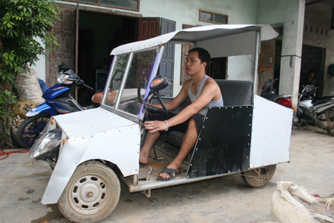Để tạo khung cho chiếc xe, anh đă dùng những ống thép hàn với nhau thành khung theo ư tưởng mà anh đă định h́nh sẵn từ trước đó. Tiếp đến là việc chế vô lăng và hai bánh trước theo cơ chế hoạt động giống như ô tô... Tiếp theo đó, anh dùng những tấm thép để g̣ và cắt làm vỏ xe. Một tuần đầu sau khi bắt tay vào làm anh đă hoàn thành xong phần khung, vỏ ngoài của xe. Công việc khó khăn nhất với anh là độ số lùi cho chiếc ô tô tương lai. Để làm việc này, anh đă nghĩ ra cách dùng bộ số của hai chiếc xe ghép đảo chiều nhau và cố định vào một hộp số do anh tự chế tạo.