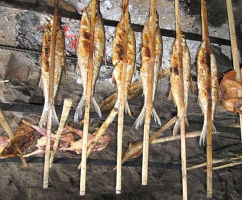 Từng con cá tươi roi rói từ sông lên được thọc các que nhỏ, dài từ miệng xuống đuôi. Sau đó, cá còn được kẹp bằng tre ở ngoài để không bị gãy, rơi khi chín. Tiếp đó, từng xiên cá ấy được đưa lên bếp nướng thơm.