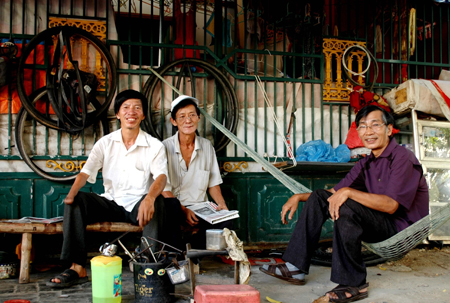Sự niềm nở vui vẻ với khách của ông khiến tôi quên hẳn cái oi bức nóng gắt đang phả trên đầu. Tuy chỉ còn một tay lành lặn nhưng những động tác lành nghề nhanh thoăn thoắt của ông khiến tôi không khỏi bất ngờ. Đúng như lời ông Vinh nói, chưa đầy năm phút, chiếc xe của tôi đã được sửa xong. Ông Vinh bảo, đây không phải tiệm sửa xe của ông, mà là tiệm sửa xe của ba anh em. Rồi đôi mắt ông Vinh hướng về phía người đàn ông dáng vẻ gầy còm, ốm yếu đang cặm cụi thay săm cho chiếc xe đạp nói: "Sư huynh tôi đó, ông ấy là Huỳnh Văn Thống (SN 1960, quê TP.Hội An, tỉnh Quảng Nam). Còn người ở đằng kia là ông Nguyễn Thạch (SN 1952), nhờ có anh Thạch mà chúng tôi mới có được công việc ổn định, chỗ ăn ở như bây giờ".