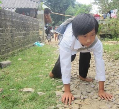 Vượt con đường rừng gần 200km, tôi tìm về tiểu khu Pa Khen 1, thị trấn Nông trường Cờ Đỏ (Mộc Châu) để gặp Lầu A Sáng. Hỏi về em, các bạn học cùng trường ai cũng biết. Cứ mỗi sáng, các bạn thấy một cậu bé, bò bằng 2 tay đến trường. Trưa cậu bò ra cổng trường ngồi đợi. Có những hôm, nắng gắt hay trời đông gió rét cậu ngồi ngoài cổng trường đã khóa im lìm. Đó là những lúc bố mẹ cậu đi làm nương xa, không kịp đón giờ tan trường.