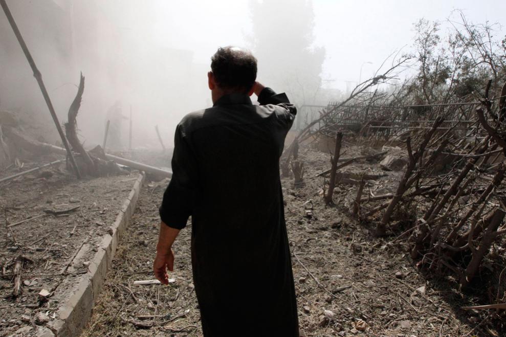 Một người đàn ông đang t́m kiếm trong khu vực được cho là bị tên lửa được cho là của Lực lượng không quân Syria tấn công tại tỉnh Raqqa hôm 21/8.