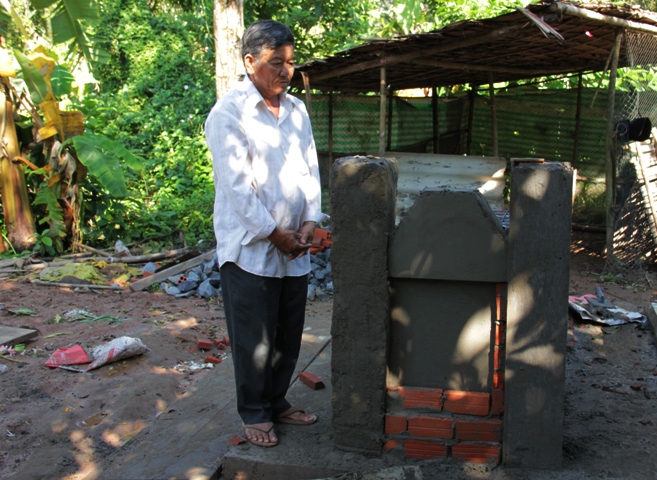 Ông Trường đứng cạnh mộ phần con trai an nghỉ cạnh ḍng sông Hậu đang được xây dựng.