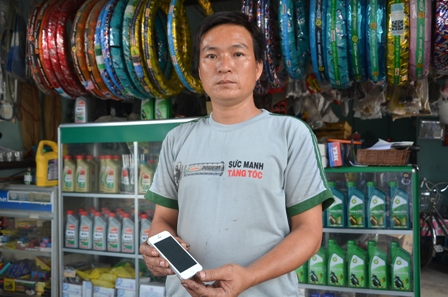 Anh Nguyễn Văn Nguyên cầm trên tay chiếc iPhone dỏm vừa bị đối tượng lừa đảo thế chấp khi mượn tiền