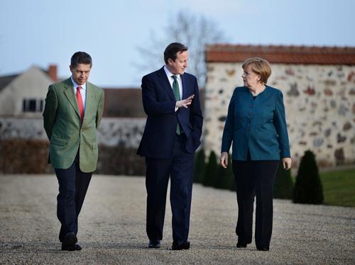 Ông Joachim Sauer (thứ nhất, bên trái) lặng lẽ tháp tùng vợ tṛ chuyện với Thủ tướng Anh David Cameron