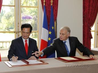 Thủ tướng Pháp Jean-Marc Ayrault (P) và đồng nhiệm Việt Nam Nguyễn Tấn Dũng ký Tuyên bố chung về đối tác chiến lược, tại Matignon, Paris, 25/09/2013, REUTERS/John Schults
