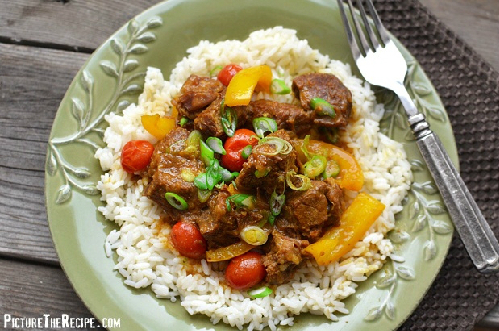 - Khi thịt đã nhừ, cho thêm ớt chuông, cà chua và nấu thêm ít nhất 15 phút nữa.