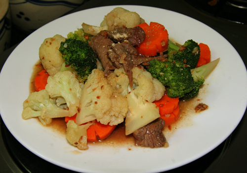 - Phi thơm tỏi, cho thịt bò vào xào nhanh với lửa lớn, tiếp đến cho rau củ vào xào chín.