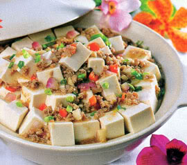 Đun nóng chút dầu hào, phi thơm hành tím, cho thịt vào xào sơ, nêm bột nêm vừa ăn. Cho đậu phụ vào thố, rưới thịt lên trên, rắc hành lá, ớt lên mặt. Đậy nắp, hấp khoảng 10′.