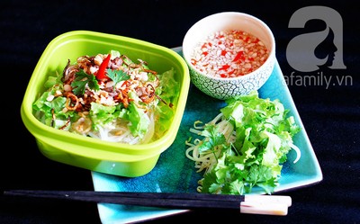 Nước trộn: nước mắm ngon, 2 thìa giấm ăn, 2 thìa đường to, ớt băm nhỏ, tỏi băm, 1 bát nước sôi, ½ thìa nước cốt chanh