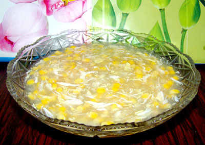 bỏ bắp đã mài nhỏ ( hoặc khui hộp bắp dể vào) đợi nước sôi lại, từ từ cho bột ngô đã hòa tan trong nước lạnh vào, khuấy hơi sánh lại.