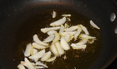 Đun nóng dầu trong chảo trên lửa vừa. Cho tỏi vào chiên khoảng 2 phút cho thơm vàng, đảo đều tay tránh bị cháy.