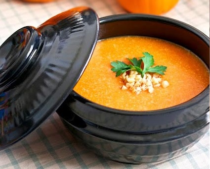 - Vớt bí đỏ ra rổ cho ráo nước rồi cho vào máy xay, xay thật nhuyễn.