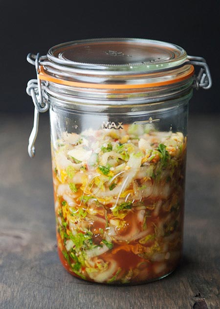 Cho kim chi cải thảo vào trong lọ thủy tinh có nắp đậy, để vào tủ lạnh.