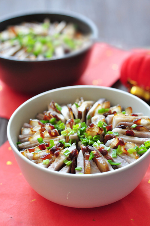 Hành rửa sạch, thái nhỏ. Chuẩn bị nồi hấp, đặt bát thịt và khoai môn vào nồi hấp khoảng nửa tiếng cho khoai chín mềm. Mang bát thịt ra khỏi nồi, rắc hành lên trên và dùng nắp hoặc một chiếc đĩa đậy nắp bát lại ngay khi còn nóng. Hơi nóng còn lại sẽ tự làm chín hành.