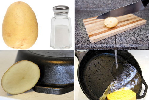 - Sau đó chà lên các phần bị bám dầu vỡ và có gỉ sét của xoong nồi hoặc chảo. Khi muối tan thì nhúng lại nửa củ khoai vào muối và tiếp tục chà cho đến khi sạch các vết bẩn.