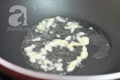 Làm nóng chảo với 1 muỗng canh dầu ăn, cho 1/2 lượng tỏi vào phi thơm.