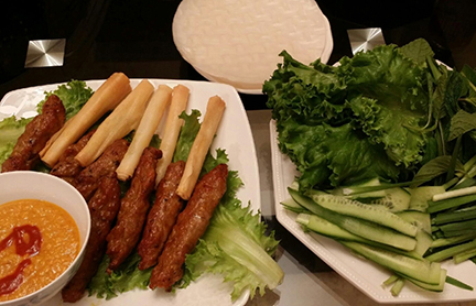 -Cuốn nem: Cuốn nem nướng với với bánh tráng, rau sống, dưa leo, hẹ cắt khúc + cuộn bánh tráng chiên giòn. Chấm với nước chấm. Ngon thần sầu!