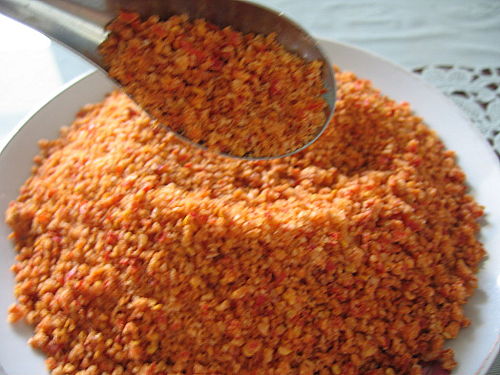 Ớt và tôm được xay nhuyễn, trộn đều với muối theo một tỉ lệ nhất định, cho thêm các loại gia vị khác như tỏi, sả... Sau đó, cho tất cả lên chảo và rang đều, đây là một quá trình quan trọng quyết định đến chất lượng hạt muối. Người thợ phải canh lửa và rang đều tay để hạt muối có màu gạch cũng như hương thơm đặc trưng của muối tôm.
