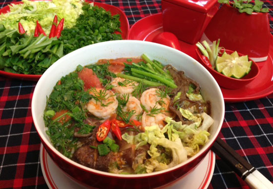 - Chế nước ninh xương vào nồi nước lọc từ đầu tôm, đun sôi nêm gia vị vừa ăn, cho cà chua, nấm hương vào đun sôi thêm 5 phút rồi tắt bếp.