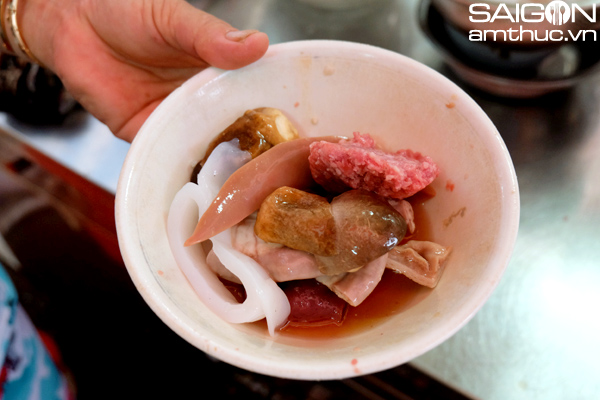 Các thành phần phèo, tim, gan, cật, mực... được nấu sôi cùng một ít cháo trắng
