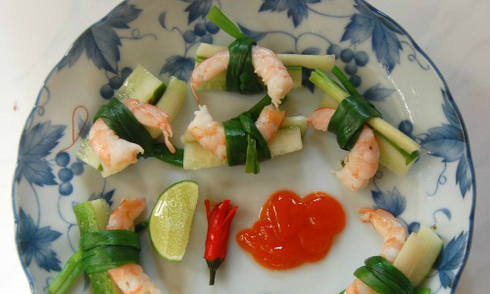 Cuộn tôm, phần hành trắng, dưa leo bằng sợi hành lá. Vị tôm luộc thơm dịu, hành và dưa leo giòn chấm tương ớt hoặc mù tạt đều rất vừa miệng.