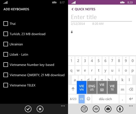 Ngay từ khi những thông tin đầu tiên được tiết lộ, Windows Phone 8.1 đă trở thành bản cập nhật được người dùng tại Việt Nam chờ đợi nhiều nhất nhờ tính năng nhập liệu bằng tiếng Việt độc đáo của ḿnh. Vẫn là hai chế độ gơ VNI và TELEX quen thuộc, nhưng thay v́ phải tốn công tải ứng dụng hỗ trợ như phần lớn điện thoại thông minh giá rẻ hiện nay, người dùng có thể chọn trực tiếp phương thức nhập liệu ưa thích của ḿnh ngay sau khi mua máy chỉ với thao tác đơn giản ngay trong ứng dụng.