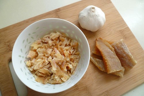- Vớt cá ra để cho ráo và nguội rồi xé nhỏ, loại bỏ hết các xương dăm. Tỏi bóc vỏ băm nhỏ.