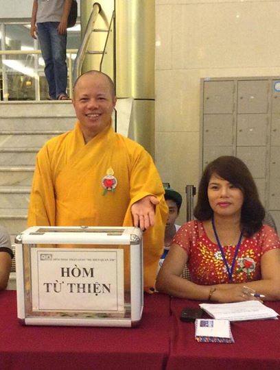 Sư Thích Thanh Cường bên chiếc hòm quyên góp