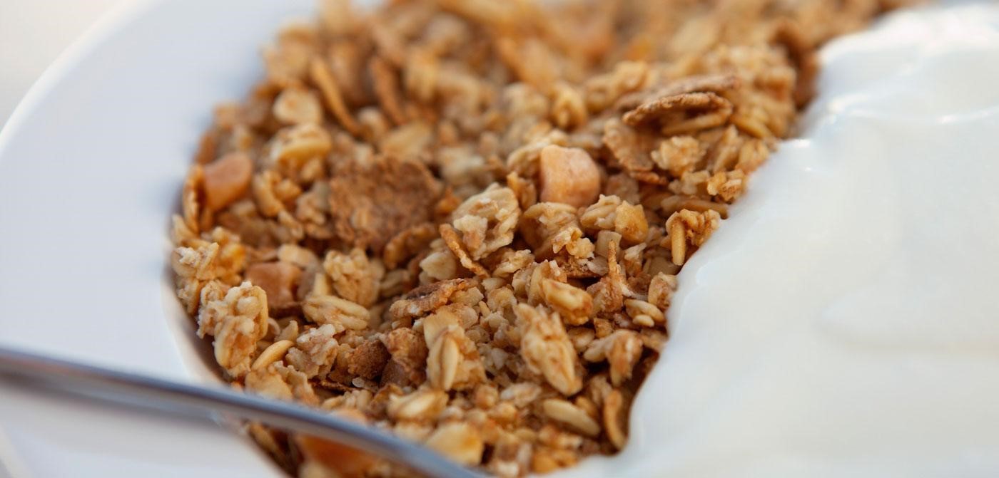 Mặc dù ngũ cốc thường có đường – nhưng hãy thử tìm kiếm "si-rô gạo nâu" hoặc "đường mía" trong danh sách thành phần - và kết luận đây là thực phẩm ít chất béo. Thay vào đó, bạn có thể chọn trộn sữa chua với ngũ cốc, các loại hạt và hạt giống