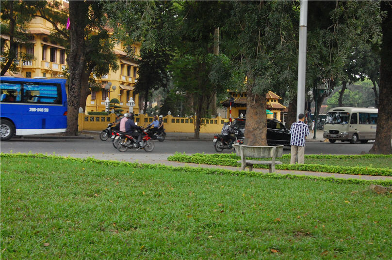 Hình ảnh không đẹp này lại thường xuyên đập vào mắt du khách. Trong hình là một người đàn ông đang tự do tiểu bậy bên vệ đường, mặc dù trước mặt ông là trụ sở của Bộ Ngoại Giao, và phía sau là khuôn viên của lăng ông Hồ Chí Minh ở Hà Nội. Ảnh: Báo Cali Today.
