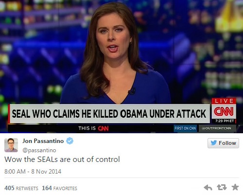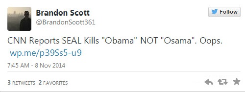 Tối ngày 7/11, hãng thông tấn CNN đã phát đi đoạn video đề cập tới những tranh cãi xung quanh việc cựu binh SEAL – Robert O’Neill nhận đã giết trùm khủng bố Osama Bin Laden vào năm 2011 trong cuộc đột kích vào nơi ẩn náu của hắn tại Pakistan. Chuyện sẽ chẳng có gì nếu không có việc thay vì viết tên trùm khủng bố là “Osama” hoặc “Bin Laden” lên dòng tiêu đề thì người đánh máy lại viết nhầm thành “Obama” – tên Tổng thống Mỹ và cũng là người chỉ huy chiến dịch truy lùng và tiêu diệt kẻ chủ mưu vụ 11/9.