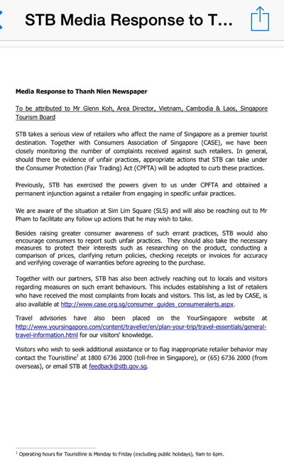 Tổng cục du lịch Singapore (STB) vừa có công văn trả lời Báo Thanh Niên về trách nhiệm và hướng giải quyết vụ cửa hàng điện thoại Mobile Air (Sim Lim Square) lừa đảo một du khách Việt.