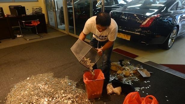 Ông Tang, 44 tuổi cho biết cửa hàng của ông đã bị bốc mùi nồng nặc từ chiều 4/11, chính vì vậy nhiều khách hàng không dám bước chân vào. Đống tiền xu này được các nhân viên thu gom vào túi nilon. Ông cho biết ông sẽ trả lại tiền cho luật sư của ông Ong.