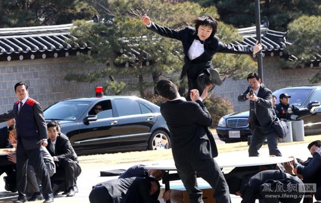 Nữ vệ sĩ của Tổng thống Hàn Quốc Park Geun Hye thể hiện khả năng võ thuật trong bức ảnh do cơ quan vệ sĩ phủ tổng thống công bố năm 2012. Ảnh: Korea Times