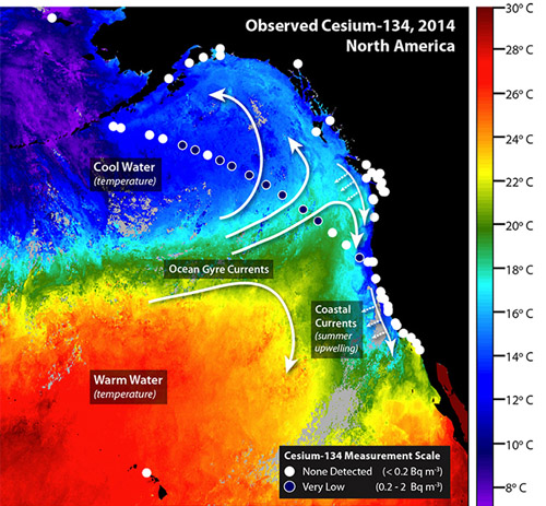 Mức độ phóng xạ thấp hơn khoảng 1.000 lần so với giới hạn có thể chấp nhận đối với nguồn nước uống theo tiêu chuẩn của Cơ quan Bảo vệ Môi trường Mỹ (EPA). Hay nói cách khác, nó thấp dưới mức có thể gây nguy hiểm cho con người hoặc sinh vật biển. Tuy nhiên theo Ken Buesseler, chuyên viên nghiên cứu của WHO, dù cảm thấy miễn cưỡng khi đánh giá thấp điều này, ông cũng không nghĩ đến việc sẽ bơi lội hay ăn cá được đánh bắt tại đây.