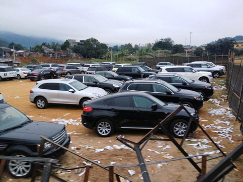 Hàng chục xe sang và siêu sang tại cửa khẩu Bắc Phong Sinh đã bị thu giữ trong cuộc đột kích - Ảnh: LĐO