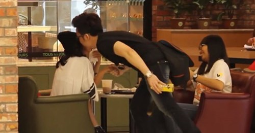 Không chỉ làm quen kiểu những câu hỏi vu vơ, anh chàng Prank còn hồn nhiên bước vào các quán cafe và thử đồ uống của những vị khách ở đó. Sau màn thử cafe, anh chàng này lại tiếp tục hành động của mình đó là chu "mỏ” lên để đón nhận những nụ hôn.
