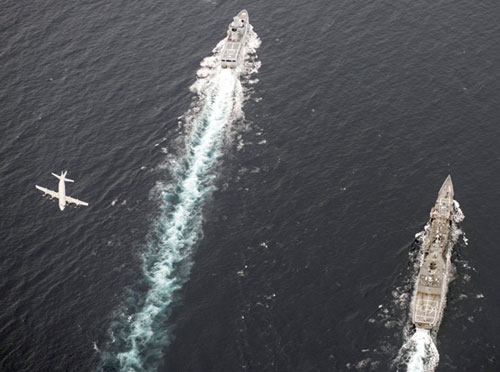 Một chiếc máy bay tuần biển và săn ngầm P-3C Orion bay trên tàu hộ tống tên lửa USS Rodney M. Davis (phải) và tàu tuần duyên của Brunei (KDB Darulaman) trong cuộc tập trận CARAT Brunei 2014 trên Biển Đông ngày 12.11.2014 - Ảnh: Hải quân Mỹ