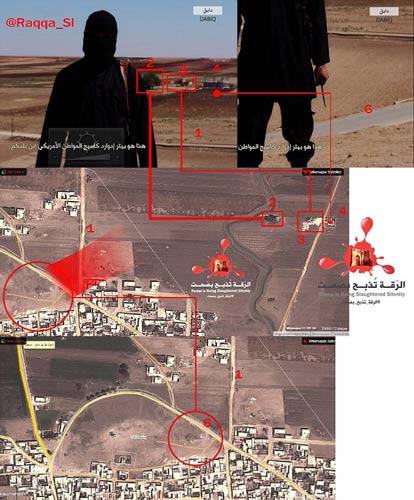 Tổ chức “Raqqa đang bị giết trong câm lặng” cho biết thêm, họ cũng đã xác định được vị trí quay đoạn video mà IS vừa đăng tải. Dựa vào các tòa nhà nhỏ xuất hiện thoáng qua trong đoạn video, Abu Ibrahim tin rằng vị trí diễn ra vụ hành quyết là trên một con đường sa mạc ở thị trấn Dabiq, cách thành phố Aleppo khoảng 47km về phía bắc.