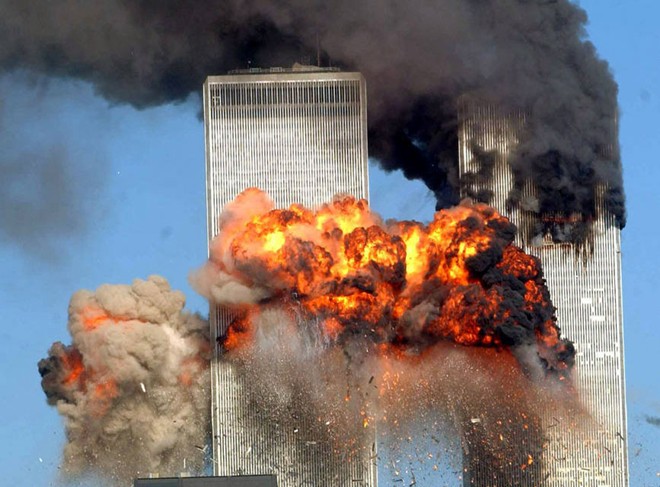 Khoảnh khắc chiếc máy bay thứ hai lao vào tòa tháp đôi Trung tâm thương mại thế giới ngày 11/9/2001. Ảnh: Getty