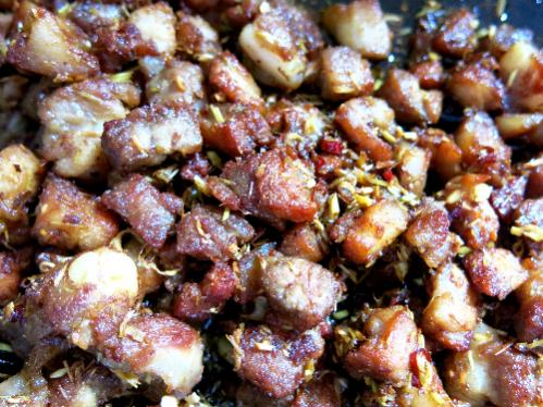 Ba rọi xào mắm ruốc ăn với cơm nóng, kèm vài miếng dưa chua, thành bữa cơm đơn sơ mà tốn cơm. Có thể ăn ngay hoặc bỏ hũ ăn dần.