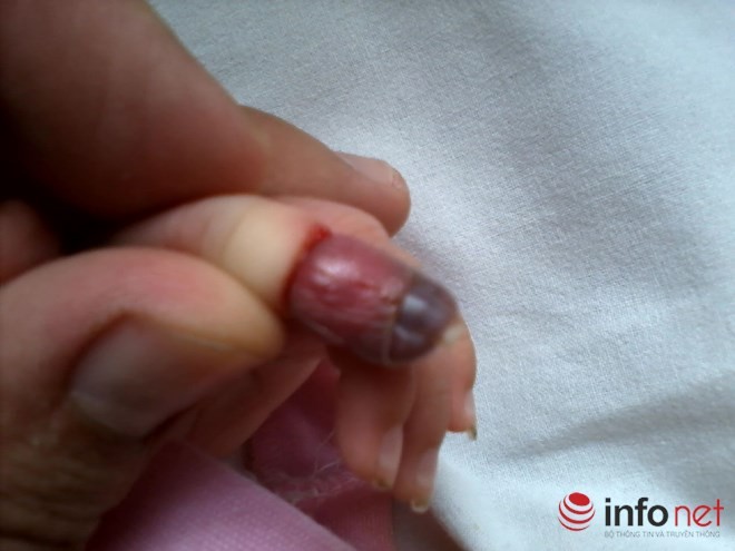 Vừa bỏ chiếc bao ra, chân bên trái của bé bị sợi chỉ quấn chặt vài vòng vào ngón chân giữa. Ngón chân tím đen vì bị hoại tử. Ngay lập tức bé được đưa vào khoa Nhi Bệnh viện Việt Đức để các bác sĩ tháo bỏ ngón chân đã hoại tử.