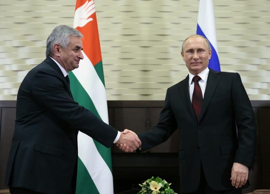 Tổng thống Nga Vladimir Putin (phải) và lãnh đạo Abkhazia Raul Khadzhimba bắt tay hợp tác