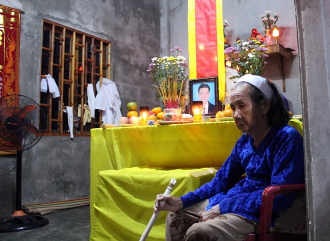 Giữa những tiếng khóc xé lòng đó, cảnh người mẹ già của anh (cụ Lương Thị Mễ, 85 tuổi) với vành tang trắng trên đầu, khuôn mặt thất thần như hóa đá trong nỗi đau quá lớn khiến nhiều người không thể cầm lòng.