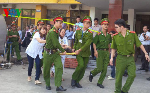 14h37: Bị cáo bị choáng ngất đã được đưa lên xe cấp cứu vào bệnh viện.